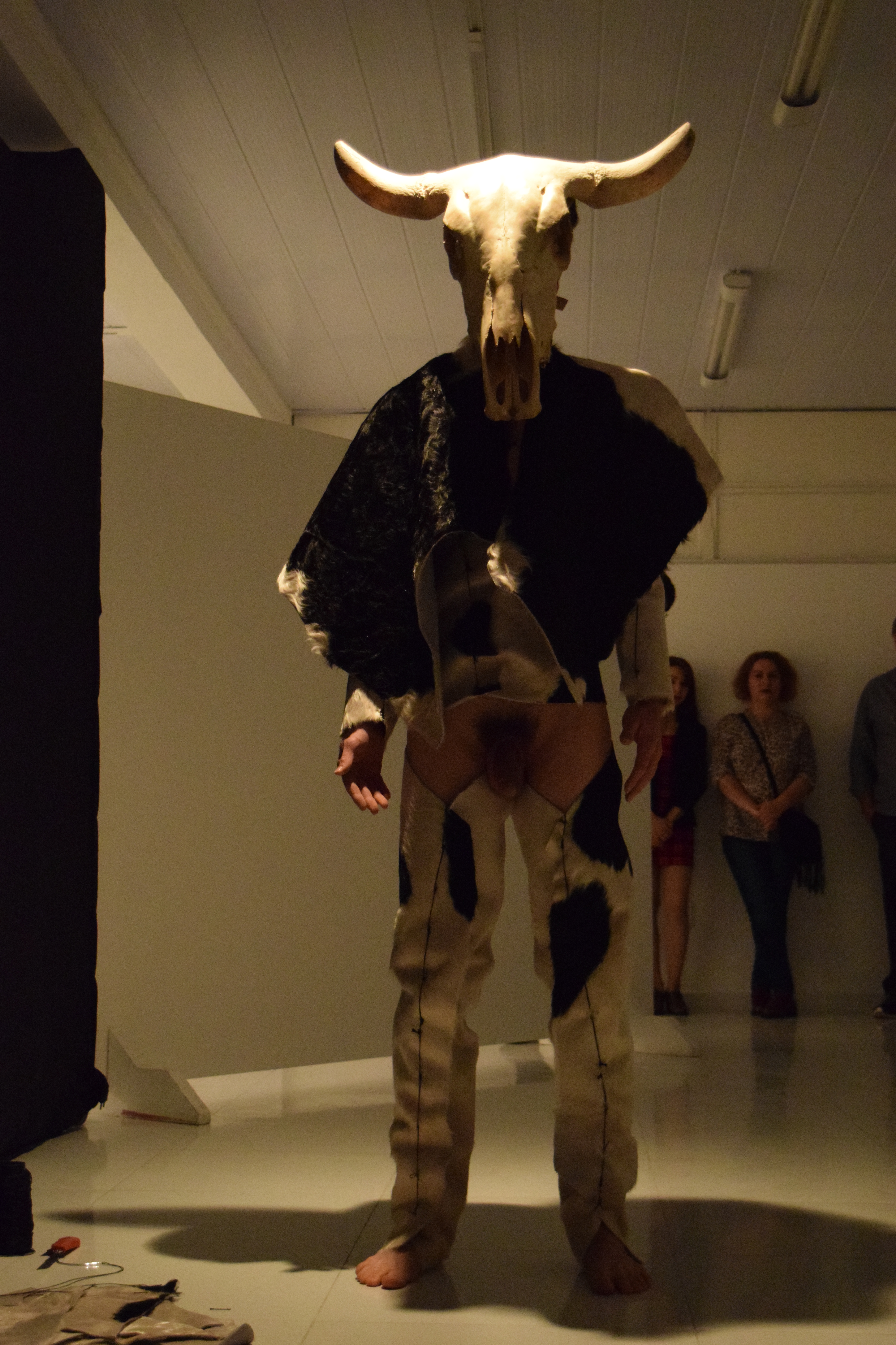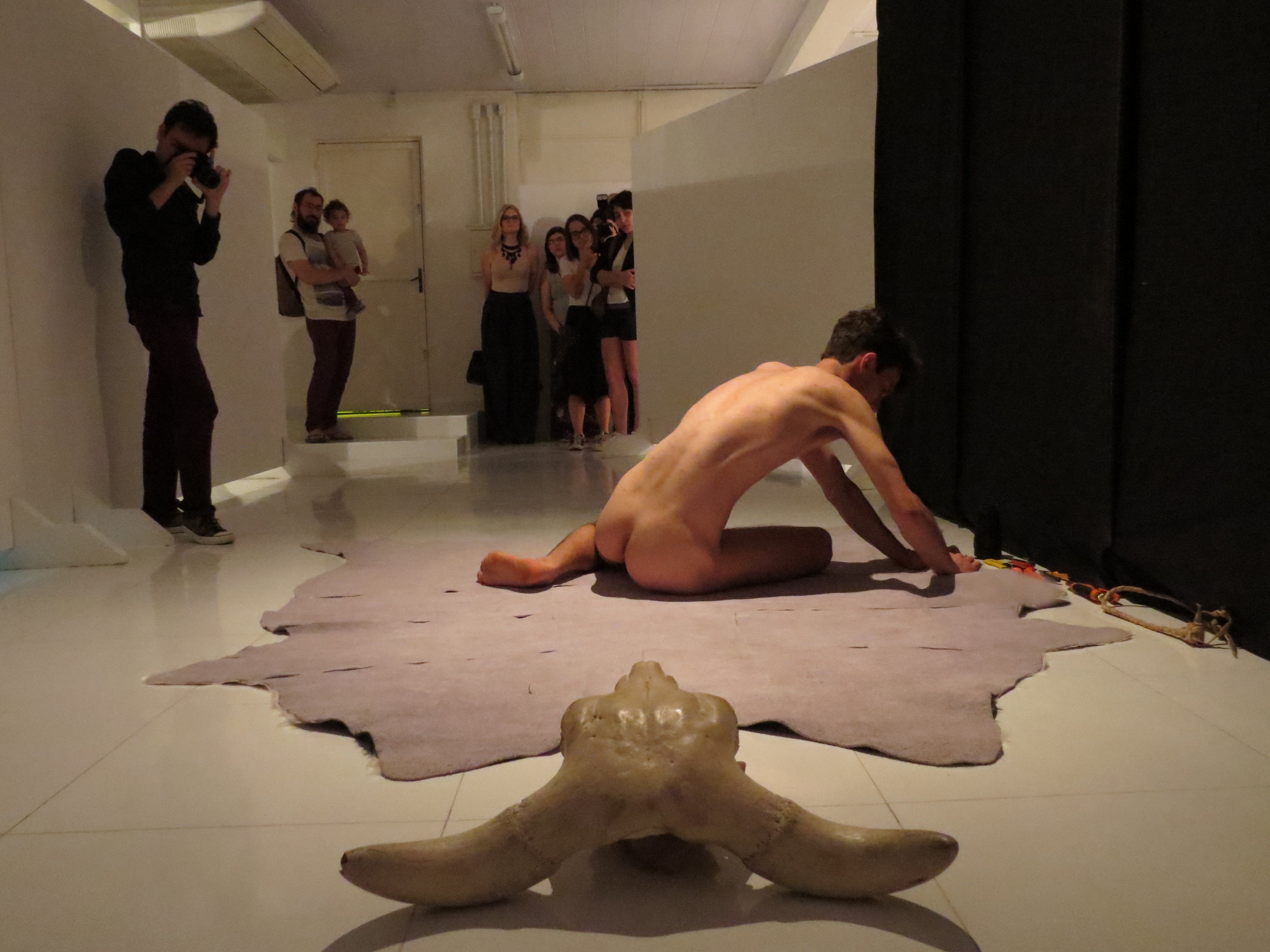 Couraça (2017) surge, assim como Brete, em um contexto de Residência Artística na cidade de Silveira Martins (RS). Nesta imersão, pudemos conversar com residentes da cidade, embora a palavra trocada só pudesse nos levar aos limiares da comunicação humana. Havia um conjunto de corpos não-humanos habitantes daquela região. Silveira Martins é uma cidade pequena cujas fontes de renda locais baseiam-se na agricultura e na pecuária de subsistência. Encontramos os não-humanos por todos os lugares, inclusive em operações de trabalho. Os animais constituem a base de operações agrícolas, eles aram a terra, transportam insumos e produção, além de transportar os humanos. Todavia, nosso encontro naquela ocasião com os animais se deu primeiro pela visita a um brete/abatedouro. O açougueiro havia abatido quatro vacas e o que restava era o couro salgado que seria enviado para um curtume. Pedi ao homem se poderia comprar o couro de uma das vacas e decidi costurá-lo em torno do meu corpo para criar uma veste de pele do animal. Naquele período o panorama político nacional era o golpe à democracia que impediu a até então presidenta Dilma Rousseff de seguir seu mandato. “Em meio a fervorosa crise política, a ascensão da direita ao poder, alimentada por um alinhamento servilista a política aos Estados Unidos da América, um golpe à democracia se instaurava. Havia um tempo que tal movimento se insinuava e nós o sentíamos. A dificuldade era aceitar que o que se desenhava em curso ganhava proporção diária alimentada pelas redes de circulação de informação falsa (Fake News) e pela criação de uma falsa crise (econômica, ideológica, e de segurança pública) animada por uma “fantasia conspiratória” (FOSTER, 2021, p. 31) criada pelo discurso da direita branca. O que era preciso fazer como artista, como pensador/pesquisador da arte para atuar contra as forças obscuras que se insinuavam? “E, em todo caso, por que agregar indignação a uma economia midiática que se alimenta da própria?” (FOSTER, 2021, p. 8). Aquilo que parecia tão óbvio para alguns de nós não era para outros. Vimos amigos próximos comprarem a ideia da crise, a ideia do benefício do golpe como força necessária a destituição dos poderes democráticos. Já não sabia “por que” ou “contra o que” as pessoas brindavam seu apoio. Tudo o que eu sabia é que o estado de exceção colocava em risco a estabilidade dos direitos humanos [e ambientais], alegadamente prejudiciais por diversas frentes da direita política. A vitória de Donald Trump nos Estados Unidos da América impulsionava o surgimento de uma direita reacionária na América Latina. No ato de votação do impedimento de governo da até então presidenta Dilma Roussef tivemos uma prova do porvir. Deus, família “tradicional” brasileira (a branca heterossexual euro-normativa), e Carlos Brilhante Ustra ganharam foco.” (Fragmento extraído do artigo Arremates em torno da suspensão como força transindividual na Performance Pequena Morte, 2017.)