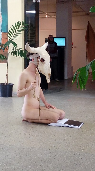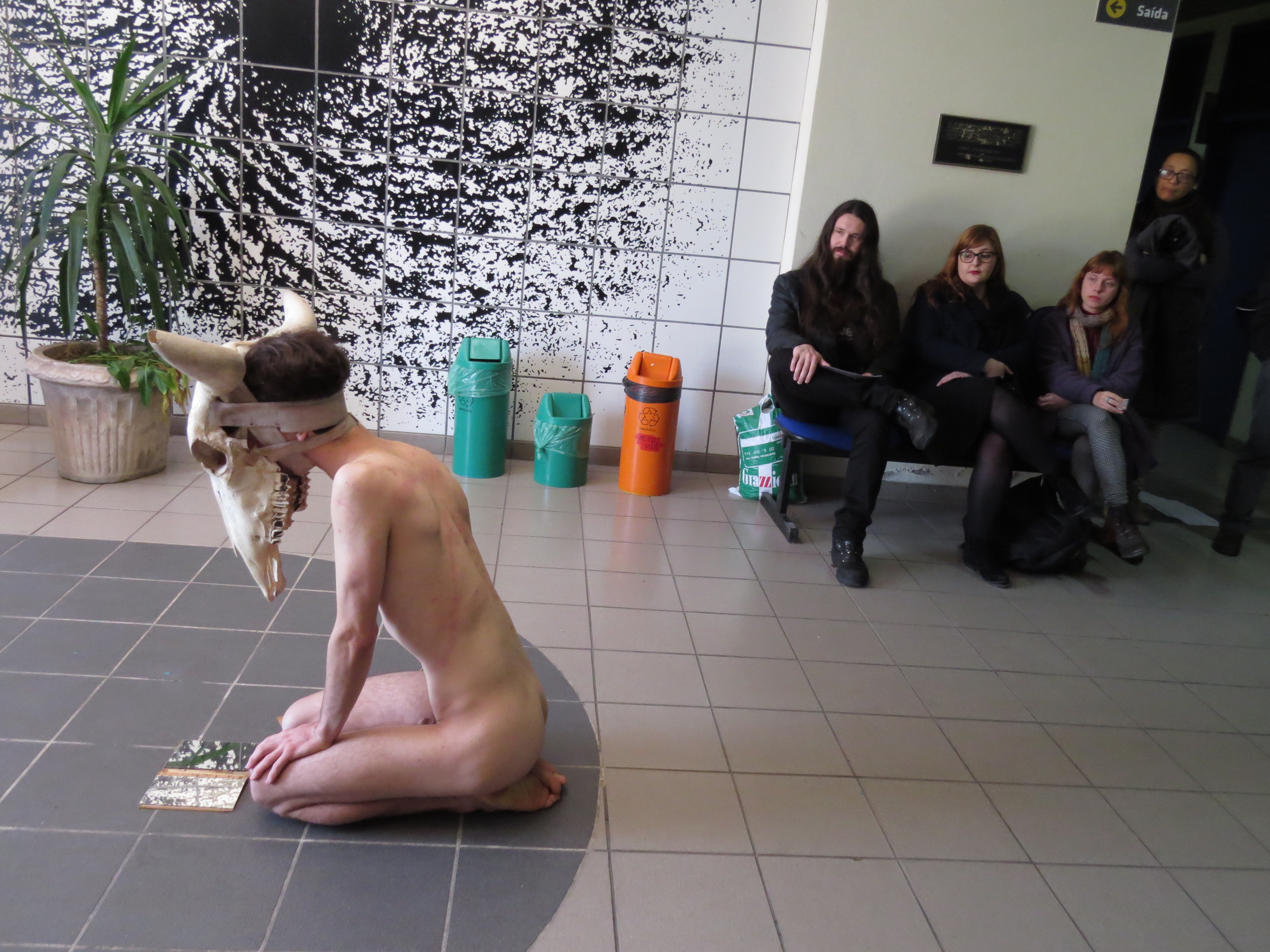 Domesticar a Vaca (2017) is a traveling performance between Santa Maria and Pelotas, both cities in Rio Grande do Sul. It was conceived as a game between the artist and himself as he sees himself reflected in a mirror glued to the inside of a book. It was developed as part of an exhibition of artist books that took place at the Santa Maria Municipal Library, where the artist sat on the immense staircase and whipped himself as he saw himself in the mirrored pages of the book. Metaphorically, the lines of the writing formed red lines of a whip on the artist’s back, which faced the witnesses. It was later re-performed as part of the traveling exhibition. In Pelotas, the performance indirectly wove connections with the bodies enslaved during the colonial period and with the production of dried meat carried out by such bodies.