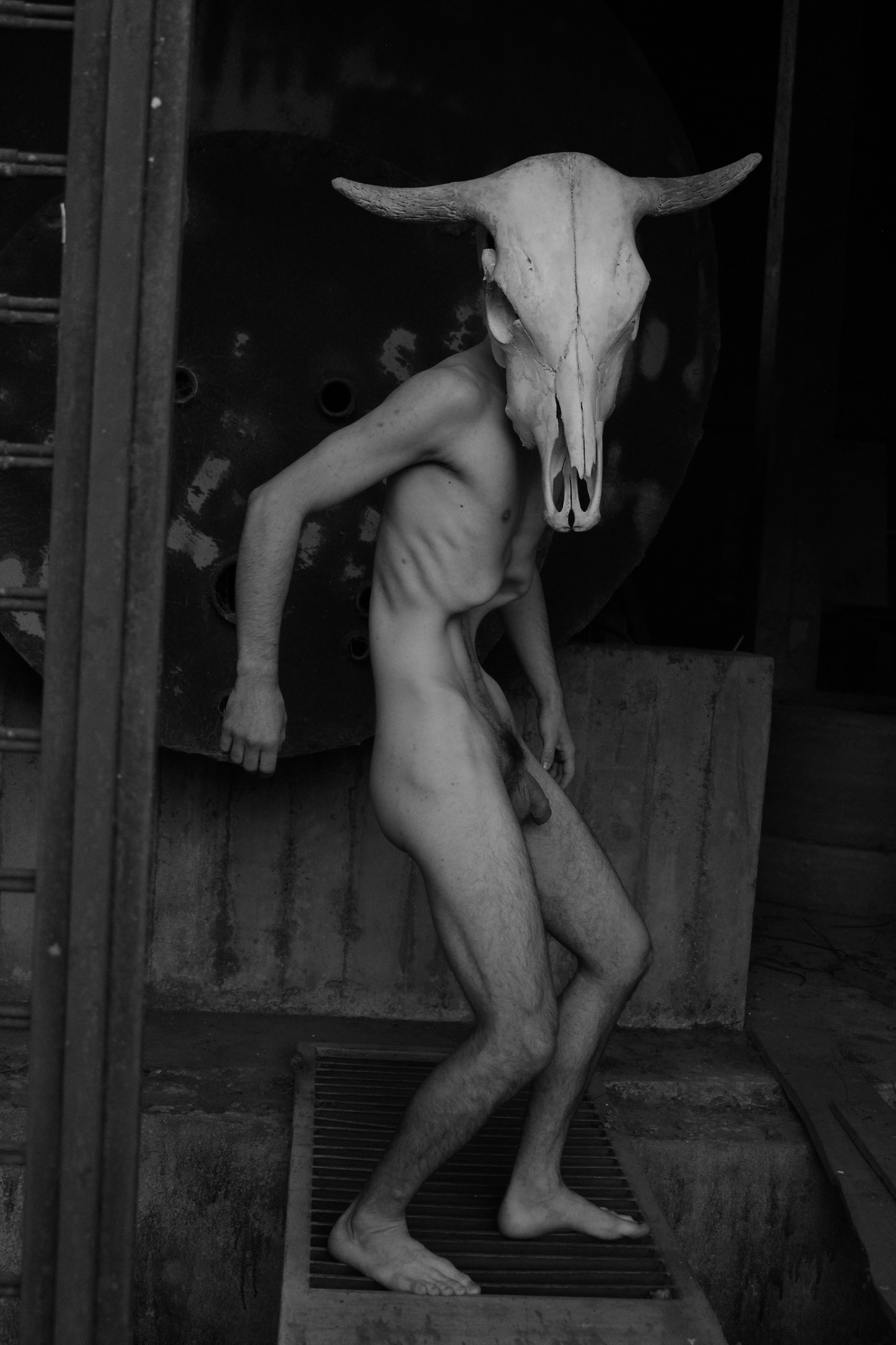 Humanimal (2018) is a set of two photoperformance images that seek to highlight the bony lines of the artist’s still-living body in composition with the bony lines of the cow’s skull that covers the face. The photographs were taken in the stall of the Universidade Federal de Santa Maria during the winter of 2018.